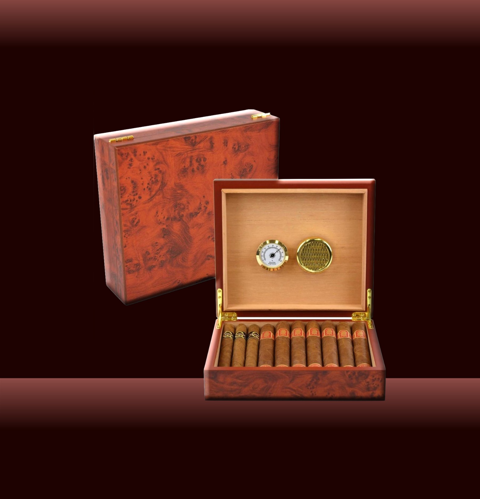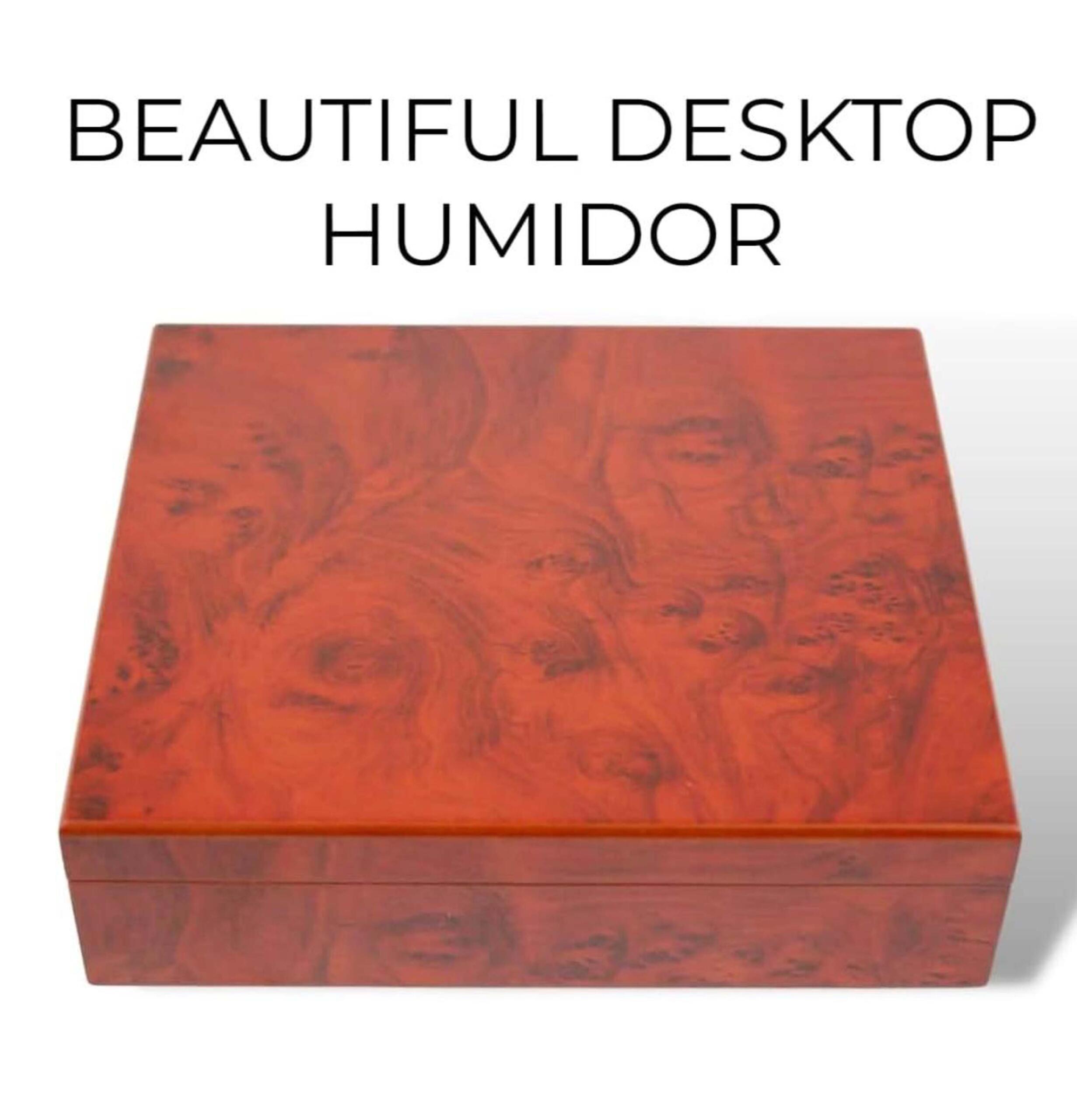 “Premium desktop cigar humidor 15-20 cigars – burnt orange finish with reliable humidity control and elegant storage for cigar lovers and collectors.”