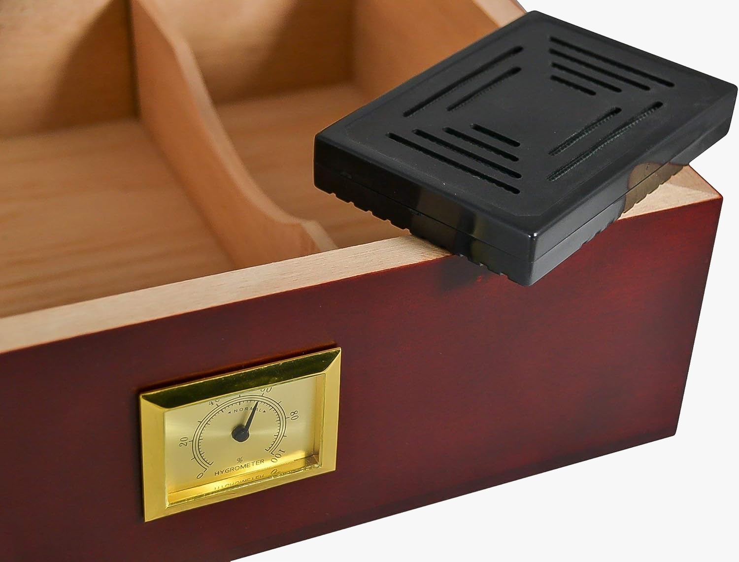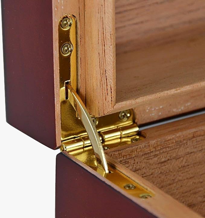 The box has an extraordinary design which features a High-quality lacquer finish, a durable metal framework on the inside, and dual interior compartments for storing your rolls of tobacco. The Solid wood construction of the box houses the Hygrometer and humidifier, which have been fixed under the internal wooden lining of the box lid. The Interior of the box is lined with high quality Oak Wood, which helps to preserve the aroma and moisture of your cigars by regulating air content in the box. The hinge of the box is designed with a solid metal frame work which makes it easy to open or close the box. The metal framework of the hinge also adds a high level of durability to the box. The overall finish of the box has a very sturdy coating that makes it resistant to scratches and skid marks. It has also been pre-calibrated and optimized for cigar storage. Its Premium finish, luxury internals, high-quality design materials, and ample storage space for up to 30-50 cigars make this humidor perfect for anyone looking for an ideal storage option for Cigars.