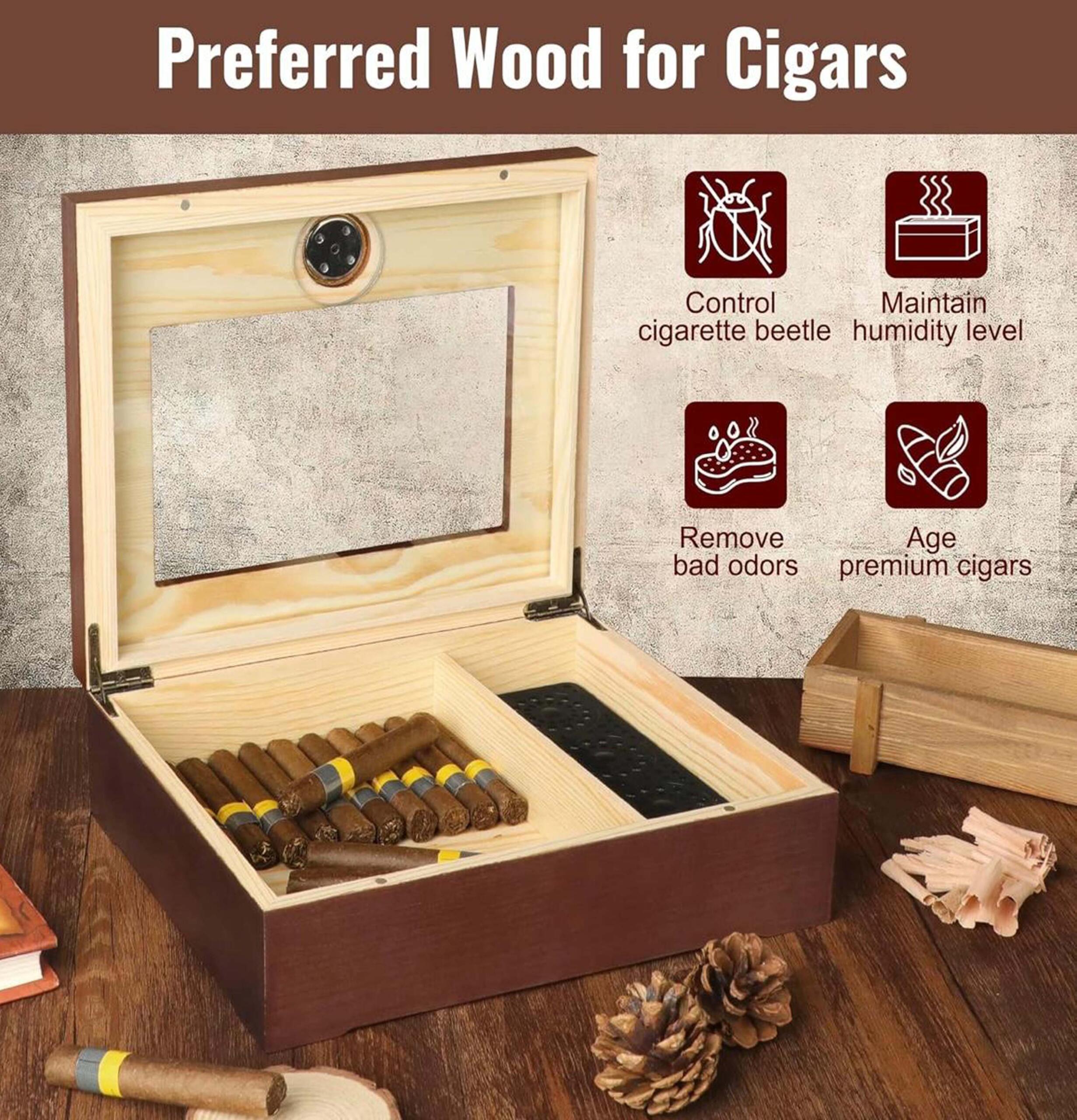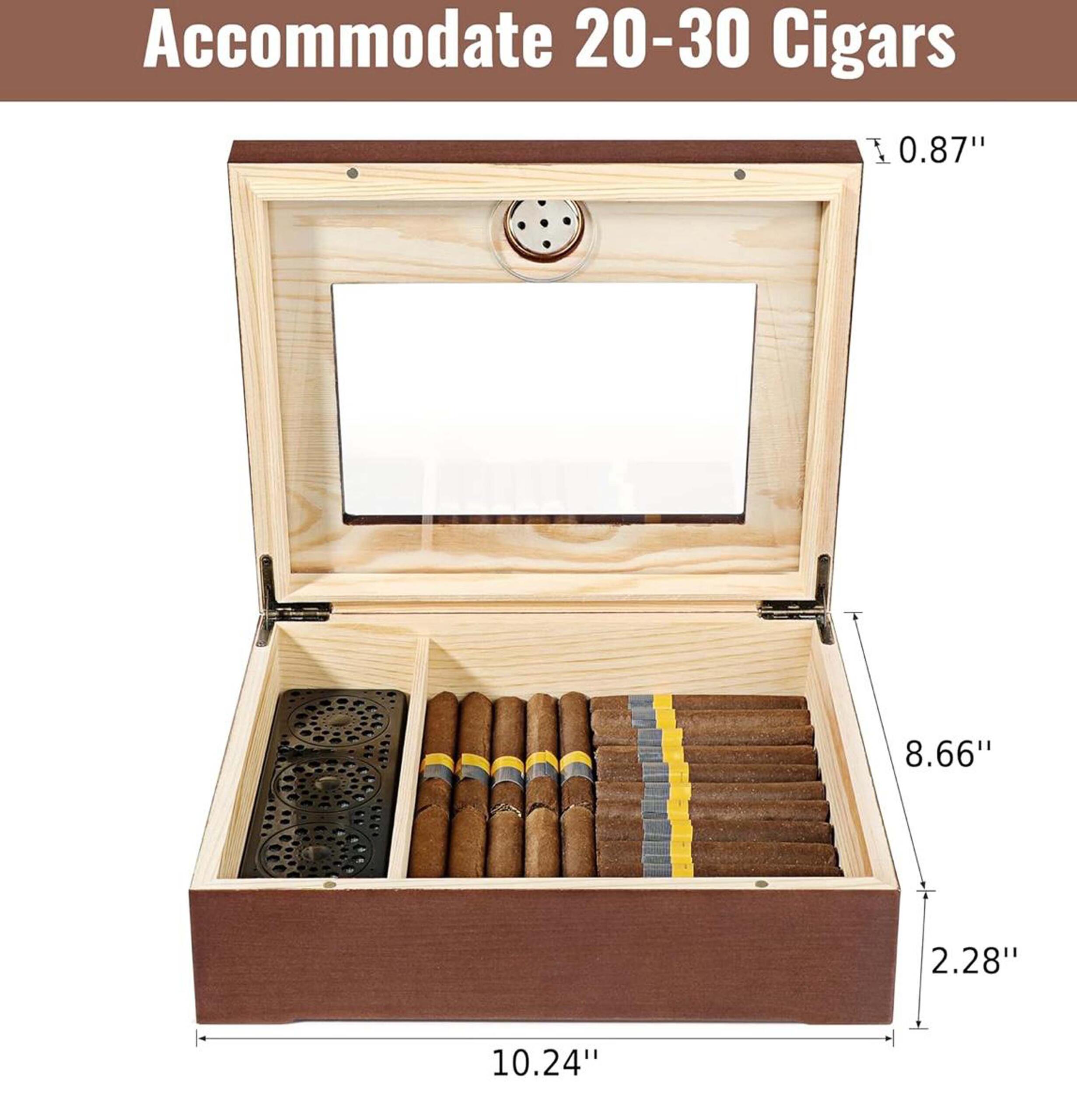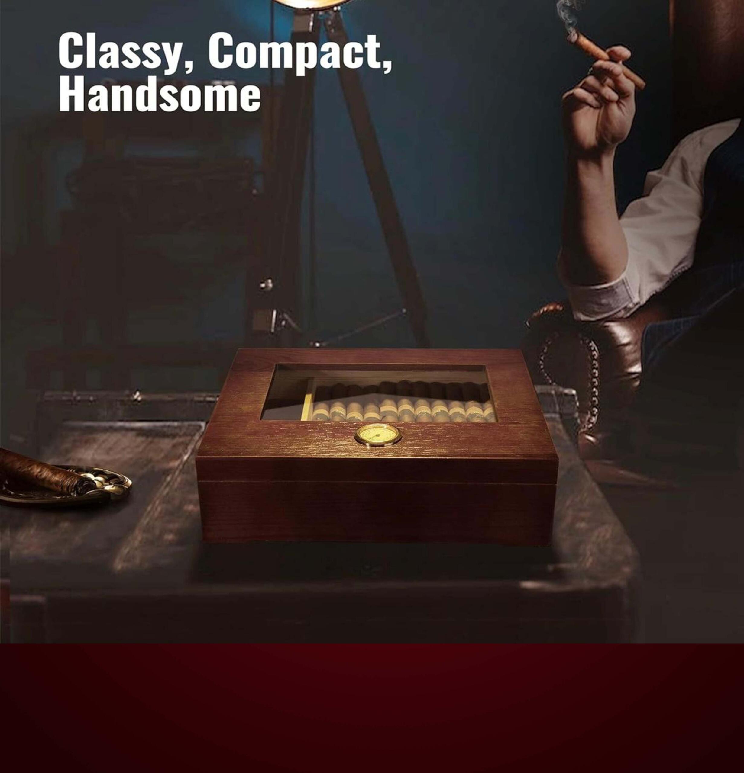 Desktop cigar humidor 20-30 cigars with retro dark brown finish, cedar lining and humidity control for stylish storage and long-lasting cigar freshness today!!