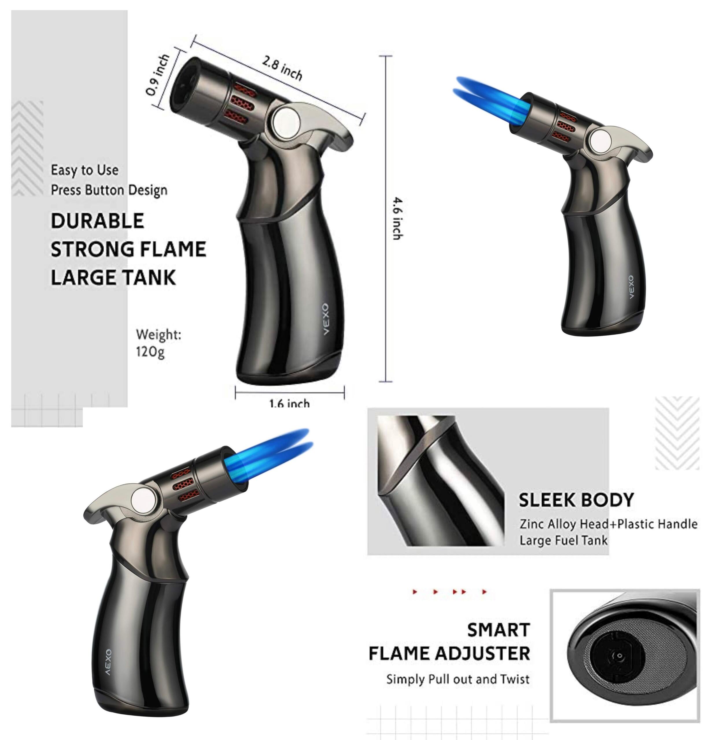 A luxury lighter with four jet torch flames, polished zinc alloy body. It’s a great gift option and provides a premium user experience. High-end lighter with quad flames for even and efficient cigar lighting. Its ergonomic shape makes it both stylish and functional. A four-torch lighter with a large fuel tank. no-frills, everyday lighter made with quality and functionality in mind. Quadruple jet flames provide an even burn, especially for Bigger cigars the large fuel tank enables to minimize refills. A well-made durable as well as reliable lighter that fits your personal style and preferences. Its designed to provide a consistent and efficient flame, making it ideal for cigar enthusiasts who value quality and performance.