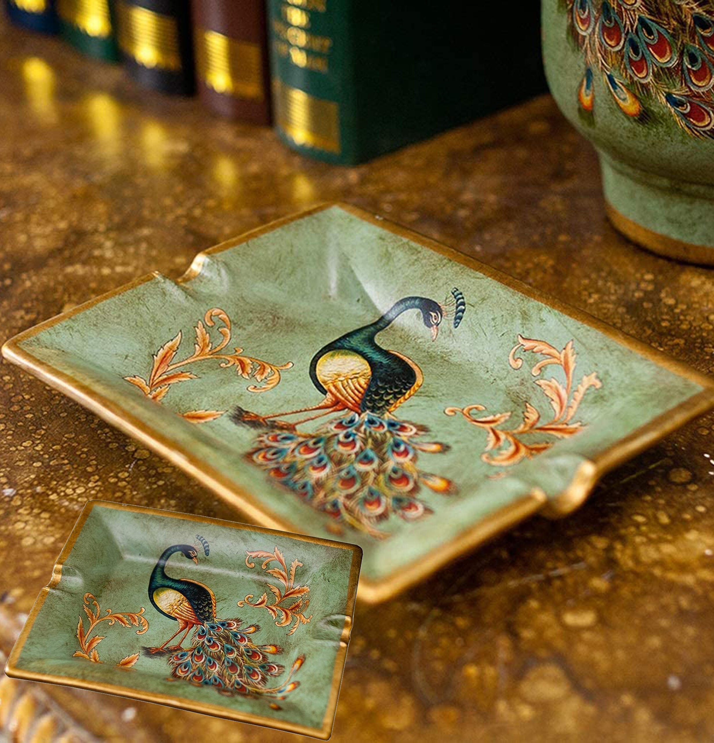 This Ornamental exquisite peacock design ashtray is inspired from European style home Décor as a perfect Ornament for your Living room, Bar or study. Its Olive green and multiple earthy color design can fit into any home décor. The Size of 18 cm x 14 cm is a comfortable carry for indoor as well as outdoor usage.