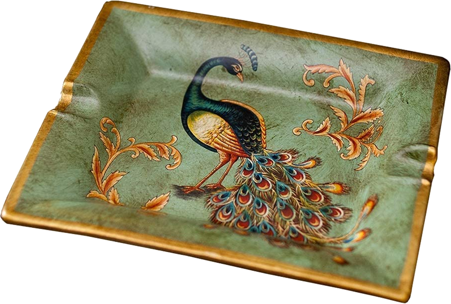 A stunning and vibrant ceramic ashtray featuring a beautiful peacock design. This ashtray combines elegance with functionality.