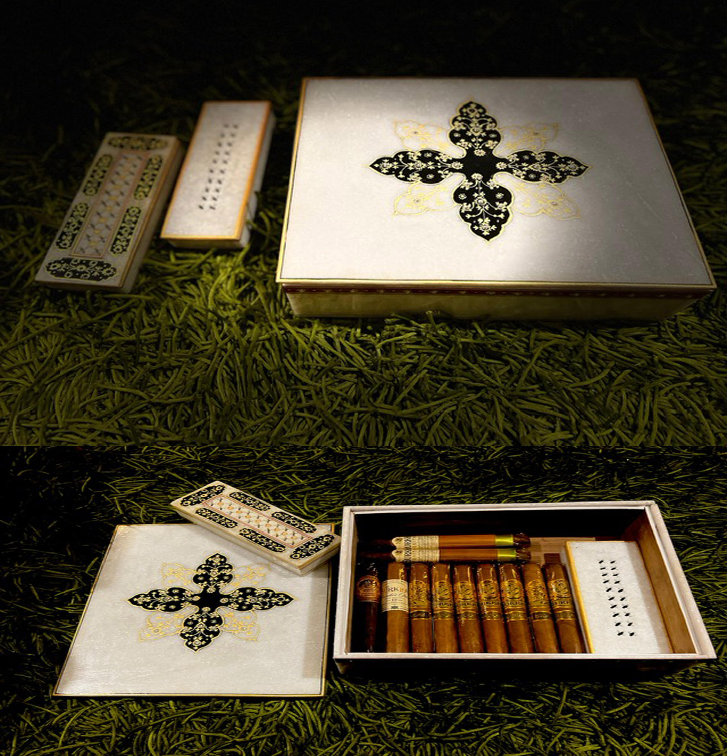 Elevate your cigar experience with The Taj Mahal Collection’s Mughal Motive inspired humidor with gold beads. A true masterpiece that combines art, luxury, and functionality.”